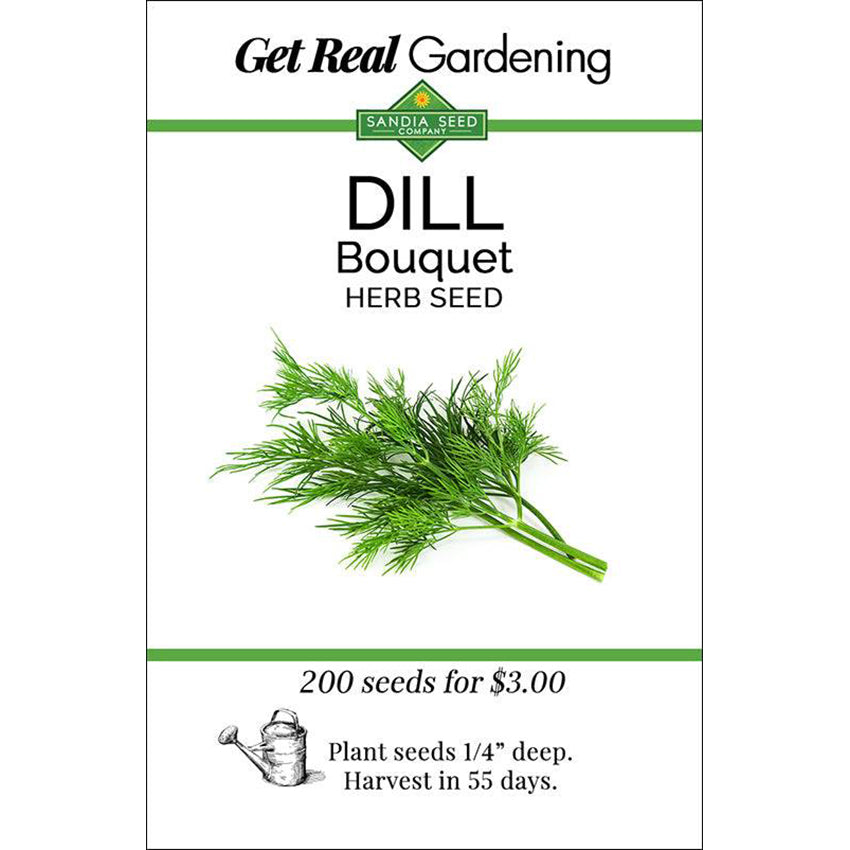 Each packet contains 200 Bouquet Dill Seeds. Anethum graveolens. Annual. Open-pollinated, heirloom, non-GMO. Harvest in 55 days.